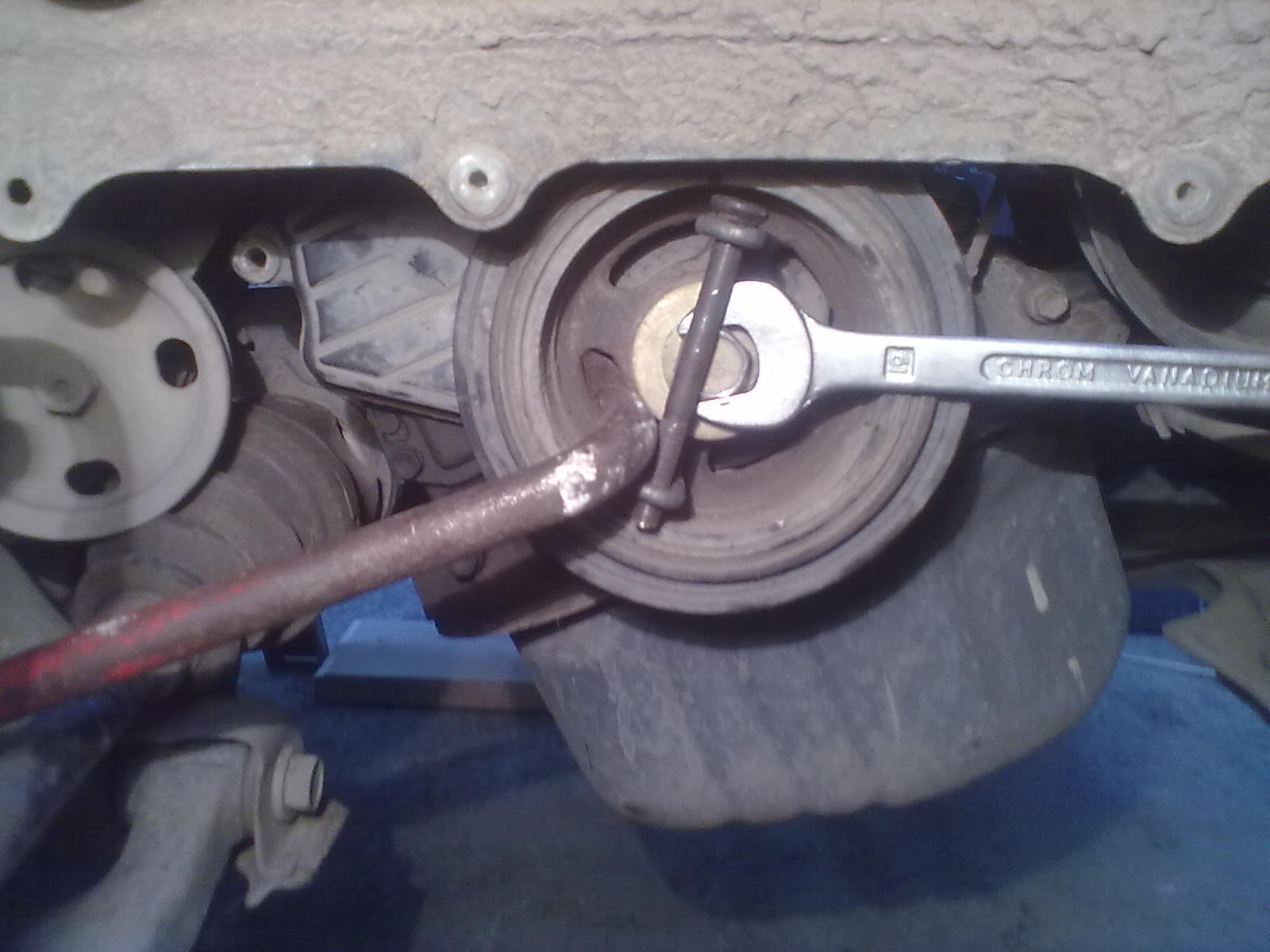 да я и так нормально сорвал. менял когдато грм на нексии, так там ещё проще - отвёртку в тормозной диск, скорость втыкаешь, на тормоза жмёшь и крутишь. тут так не прокатит. но сорвал очень быстро - уверенно "распёр", трубу в какчестве рычага и опачки!