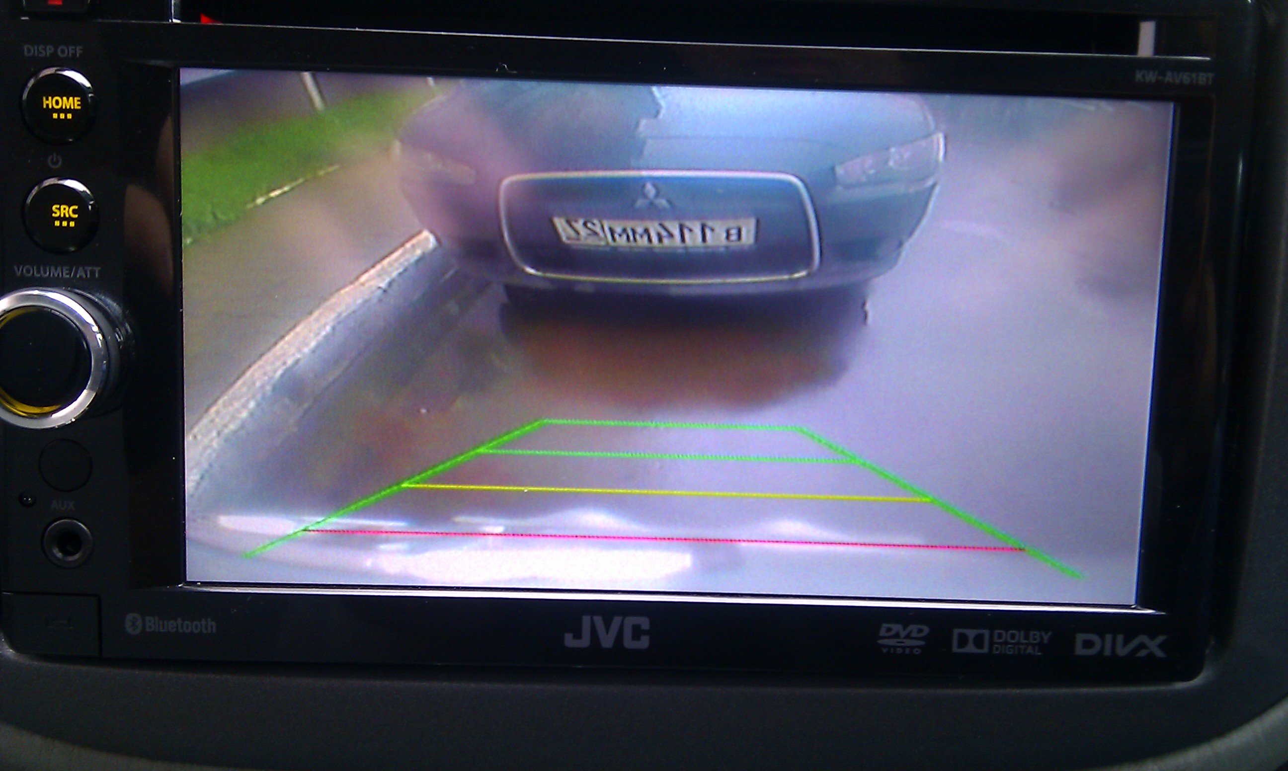 на экране видно бампер, рамку и все вокруг. Есть линии разметки, красная линия вдоль бампера.....в принципе доволен, мертвую зону видно, можно парковаться к столбикам. На улице мокро, идет деждь и на камере висят капли, которые как линзой размывают изображение....не всегда же будет идти дождь))