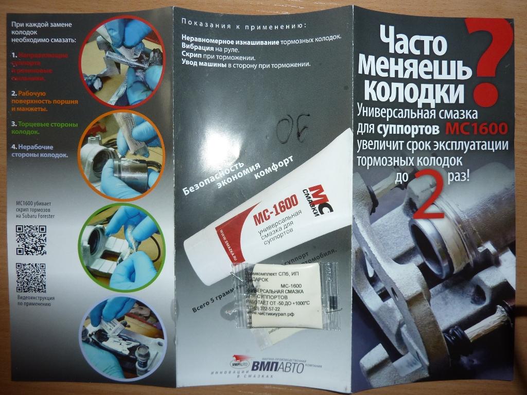 02.08.2013На этой неделе поменял тормозные колодки. Вообще хотел Nishinbo, но их не оказалось. Взял Tokico RN600M. Продавец заверил, что хорошие. По цене также как и Нишинбо - 1200 р. Поскольку при торможении или трогании с места часто слышится специфический "хруст", прикупил универсальную смазку для суппортов MC1600. Вот статья о ней. Вложение: