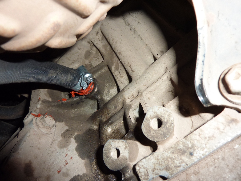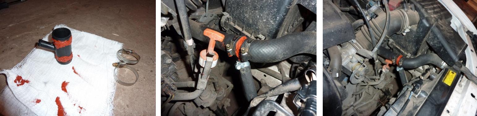 Обмазал штуцер герметиком и надел шланг (не забывайте выждать минут десять, чтобы герметик немного схватился). Винт на хомуте закрутил головкой, надетой на отвертку, в ручку которой, в свою очередь, вставлена насадка-удлинитель и потом уже трещетка. Шлицевой отверткой, как писал выше, затянуть хомут нормально не получилось. Первый шаг на пути к будущему теплому запуску пройден!  Вложение: