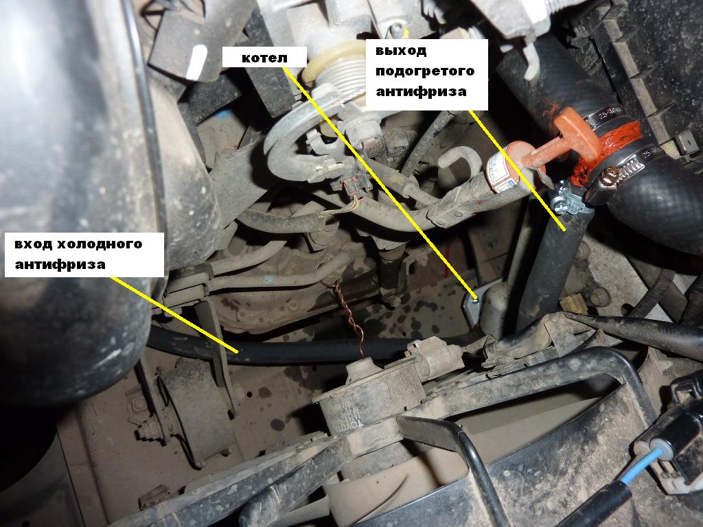 Осталось вставить в тройник выходной шланг подогревателя. Перед этим в него через воронку с тонким носиком нужно залить антифриз (т.е. в котел). Вложение: