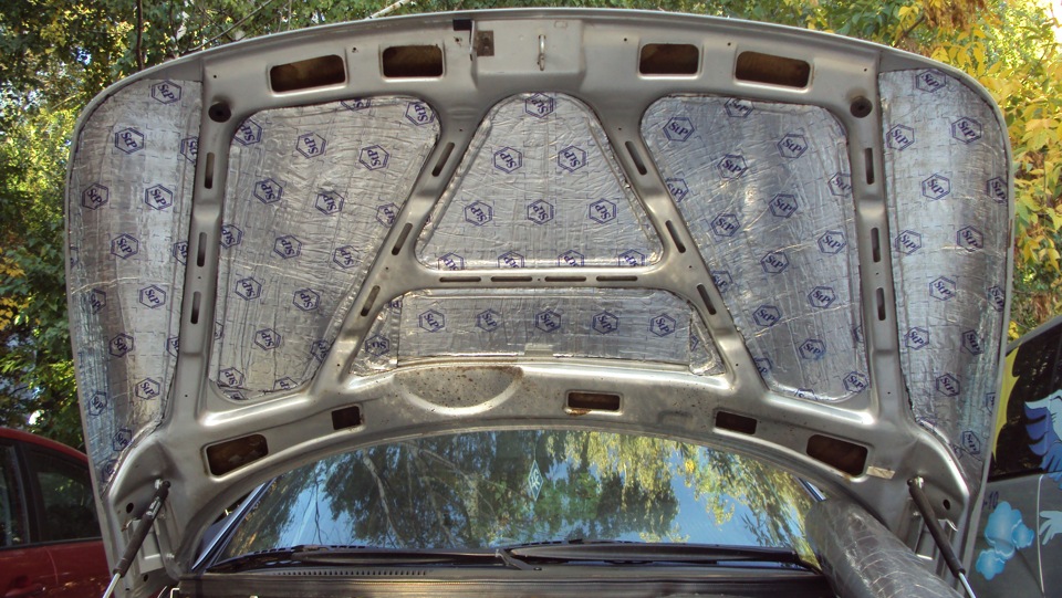 02.08.2014Виброшумоизоляция капота.Когда брал машину, делал химчистку. Заодно заказал мойку двигателя. Вместе с движком инициативный мойщик помыл и капот, в результате чего штатная теплоизоляция пришла в негодность. Решил сделать новую, покруче. Значит, снимаем, если есть, штатный утеплитель и отмываем подкапотное пространство. Шланчики, идущие к форсункам омывателя, отсоединяем, чтобы не мешались. Берем лист Вибропласт Голд и вырезаем кусочки таким образом, чтобы они закрывали капот между ребрами жесткости. У меня получились заготовки без напуска на ребра жесткости. Кто-то делает с напуском. Так как в первый день фотоаппарат я забыл, то фотал на телефон и снимки подкапотного пространства получились почему-то очень темные. Поэтому для примера взял фото из интернета. Вибродемпфер без напуска на ребра жесткости: Вложение: