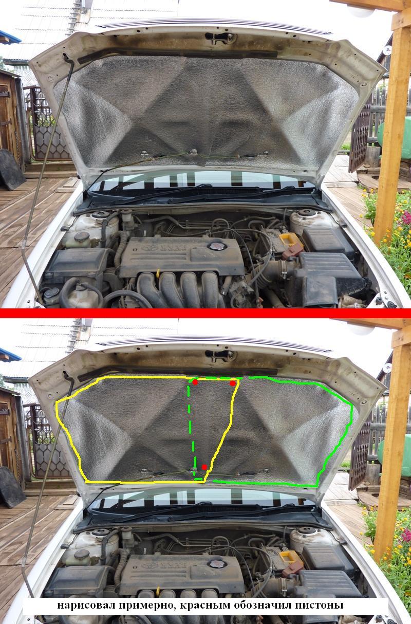 После того, как готовы все отрезки, хорошенько обезжириваем подкапотное пространство, и клеим - сначала вибропласт, затем акцент. Перед наклеиванием акцента снова используем обезжириватель. Обязательно! Незаметно подкрался вечер и я поехал домой (с машиной вожусь на даче). На следующий день было намечено наклеивание сплошного листа шумоизолятора. Кстати, Акцент, в случае обработки капота, выполняет больше роль теплоизолятора, чем шумопоглотителя. Какое там шумопоглощение, когда есть огромная дыра в виде решетки радиатора.  Хотя в салоне двигатель стало потом слышно поменьше. К сожалению, длина листа акцента меньше ширины капота (в строительных магазинах самоклеющийся теплоизоляционный материал шире 60 см я тоже не нашел). Пришлось делать из двух частей. Процесс описывать не имеет смысла, нет ничего сложного. Но ловкость рук не помешает. Единственно, советую сфотать капот перед наклеиванием листов шумо- (или тепло-, кому как больше нравится) изолятора. Снимки пригодятся для последующего поиска отверстий под пистоны. Ну и не забываем обезжиривать! На этот раз фотоаппарат я не забыл. Половинки вырезал таким образом, чтобы они друг на друга наложились с достаточной площадью, и чтобы место соединения можно было надежно закрепить пистонами. Вложение: