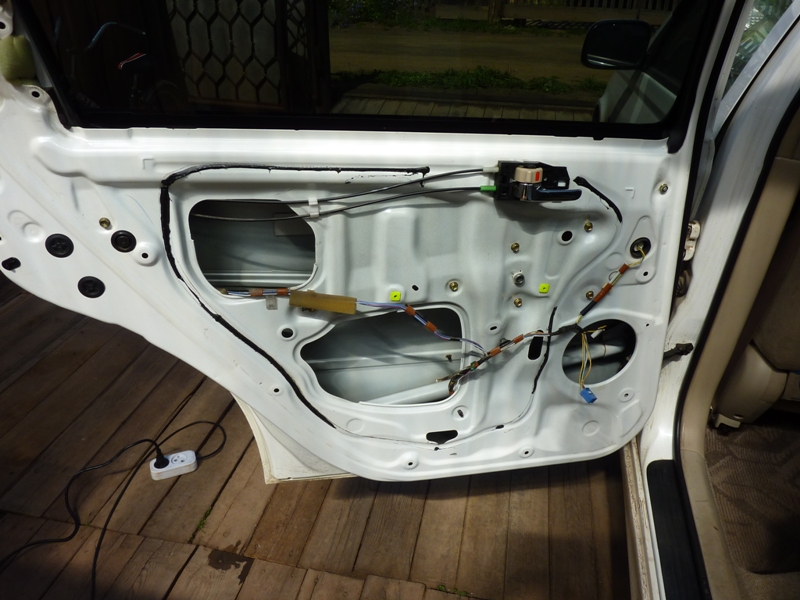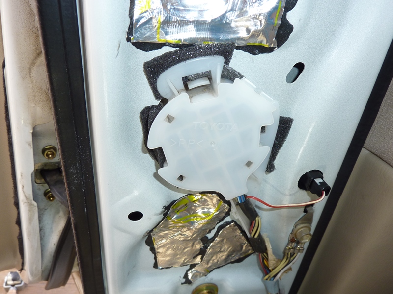Роль штатной шумоизоляции выполнял полиэтилен.  Как мог... Изо всех сил, но...  Снимаем его. Герметик подрезаем ножом, но можно и просто оторвать. Потом снимаем динамик. Динамики на заклепках: в передних дверях на четырех, в задних на трех. С ними придется повозиться. Если при кромсании заклепок какие-то кусочки провалятся внутрь двери, не страшно - можно будет их подтолкнуть к сливным отверстиям, откуда они сами вывалятся. Вложение: