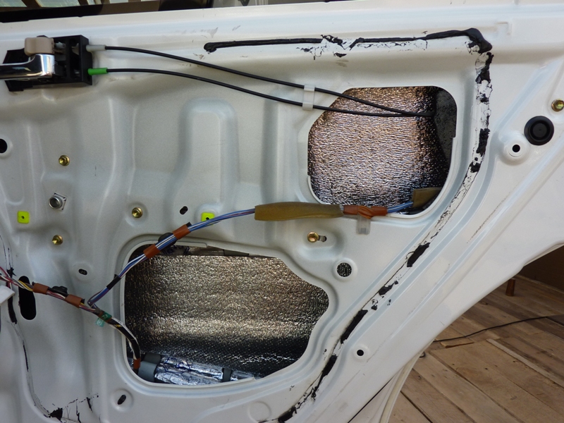 Некоторые клипсы, крепящие проводку, я перед обработкой двери снимал, чтобы провода не мешали клеить материал. Перед тем, как ставить их обратно, я на всякий случай подклеивал под них бипласт. Вложение: