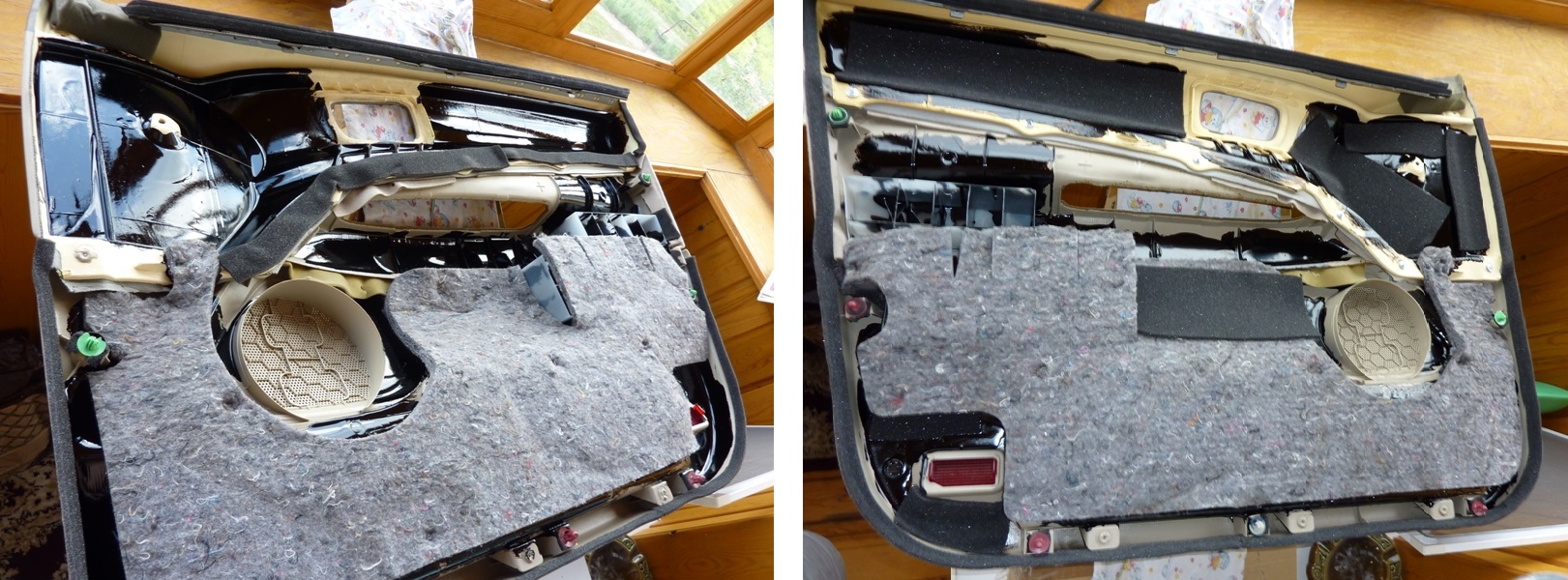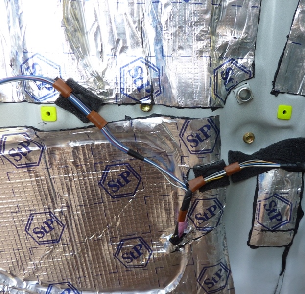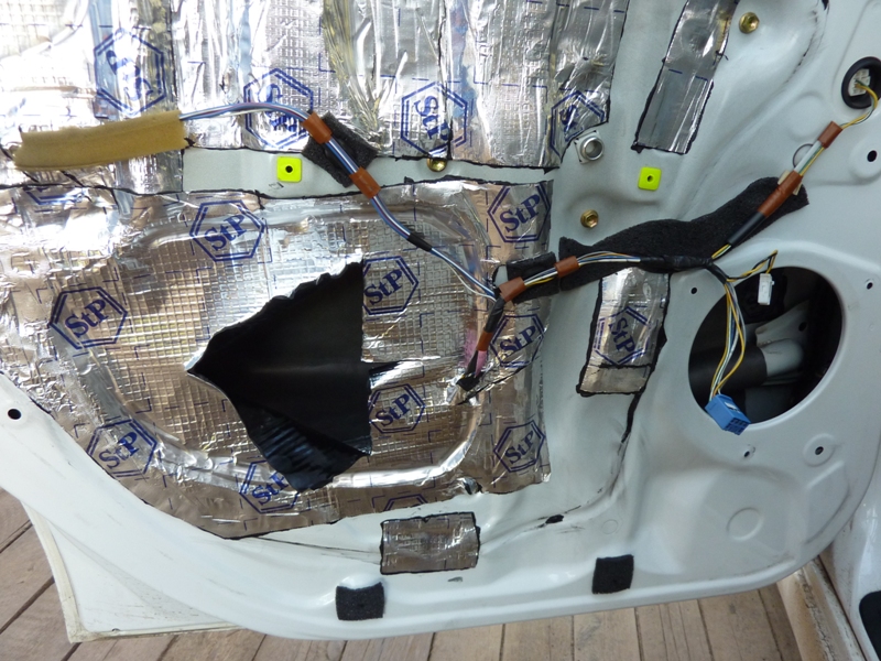 Отстегиваем все фишки и клипсы проводки, которые только снимаются. Клеим под них бипласт 5мм. Также проклеиваем бипластом между проводами и металлом двери. Теперь через отверстия от фонарей начинаем просовывать к центру двери скрученные в два (а где-то и в три) слоя куски поролона. Таким образом, чтобы они потом никуда не съехали. Вложение: