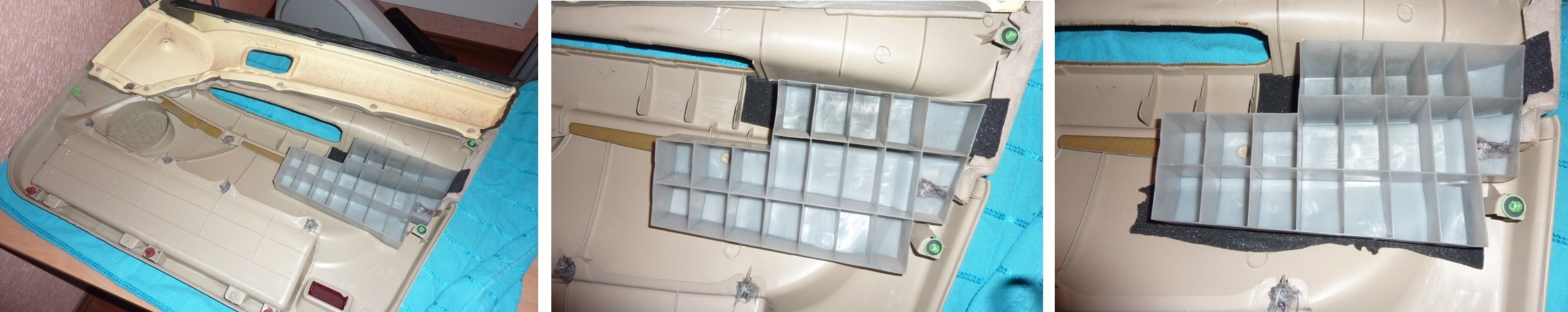 Виброшумоизоляция дверей. Часть 2. Дверная карта.Снимаем с накладки двери утеплитель, просто отрываем (закреплен в нескольких точках). Отмываем пластик. На всех накладках есть ребра жесткости (предполагаю, что это ребра жесткости), которые я называю "сотами". На картах передних дверей большие, на задних - маленькие. И те и другие гремят о пластик, поэтому под них я подложил бипласт (5 мм). С накладками задних дверей никаких проблем не возникло. "Сота" при некотором усилии снимается. Приклеиваем под нее и в нее (снизу) кусочки бипласта. Вложение: