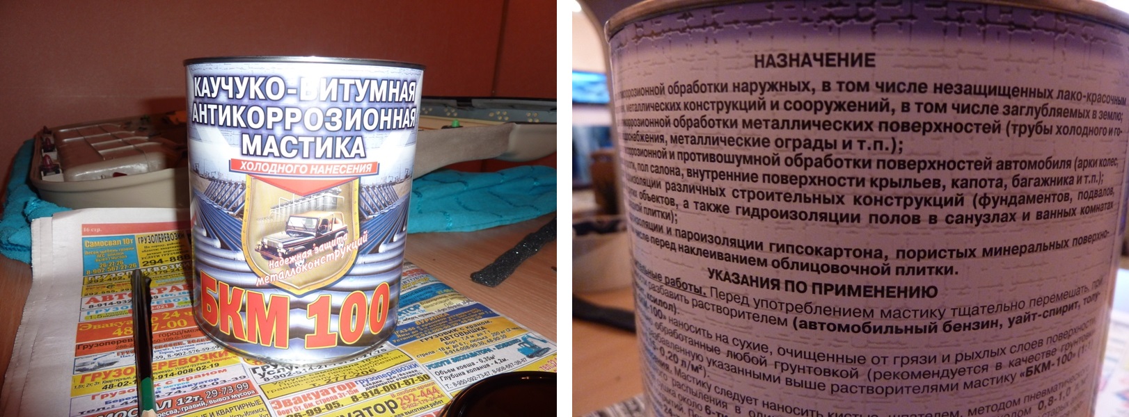 В магазинах с красками и в автомагазинах продается клевая вещь - битумная мастика. От очень густой (например, "Кордон") до жидкой. Бывает битумная, битумно-каучуковая и резино-битумная мастика. О разных консистенциях я на тот момент не знал и взял первое, что понравилось. Мастика оказалась жидкой. Ну и ладно. Вложение: