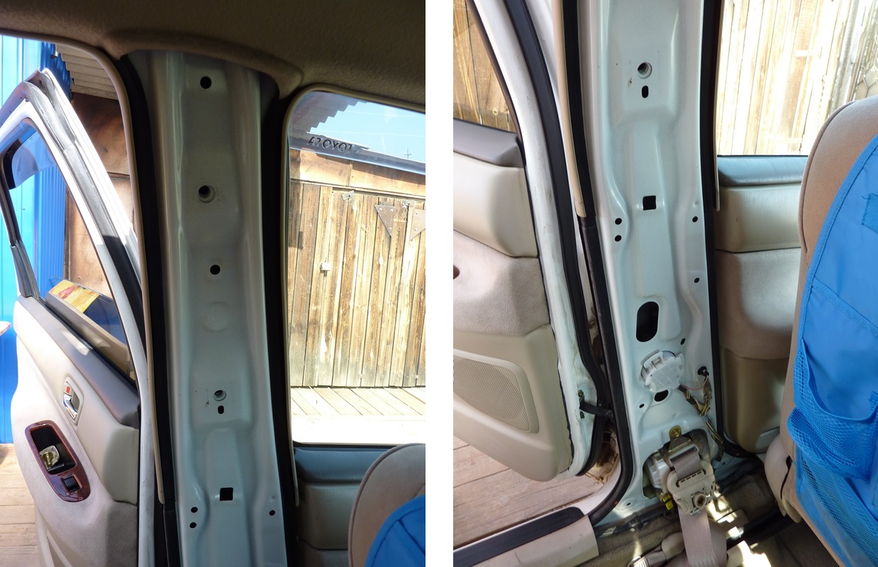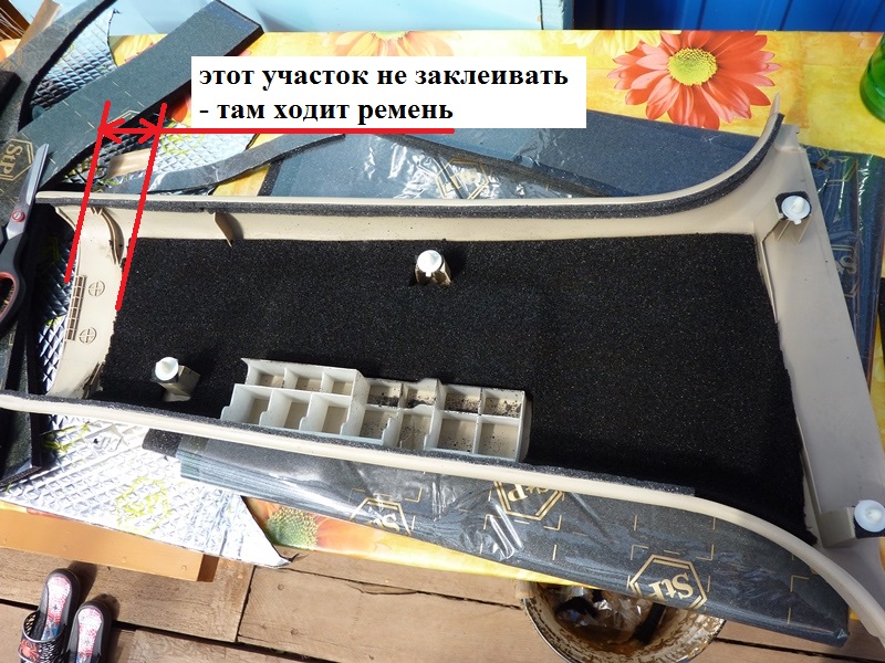 Наклеиваем битопласт 5мм (крепление-бегунок ремня безопасности предварительно открутили). Это антискрип и шумоизолятор. В тот момент у меня его не оказалось и я наклеил бипласт 5мм - уплотнительный материал и немного шумоизолятор (хотя 5мм вряд ли что-то решают  ) Вложение: