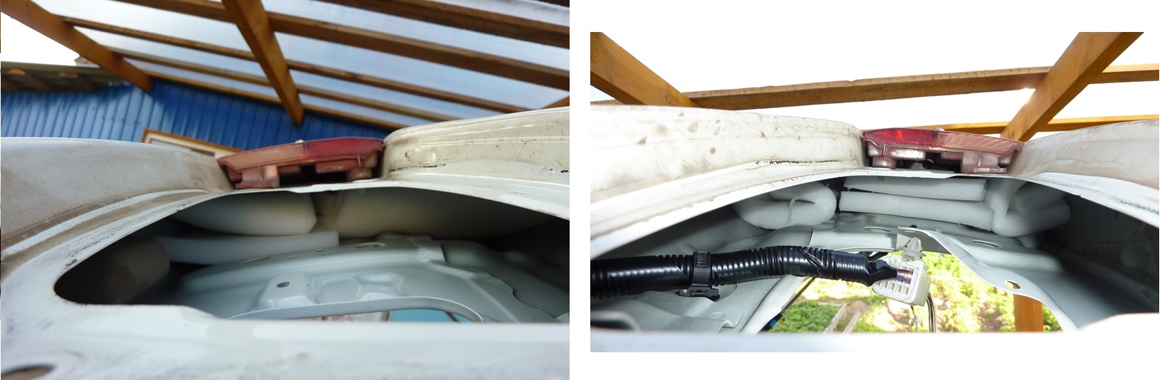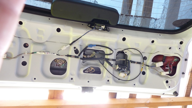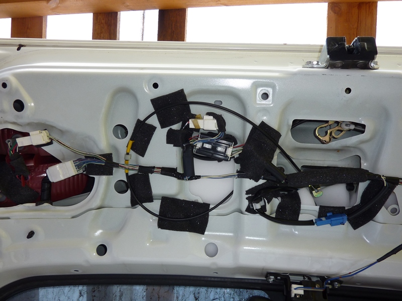 Ставим назад фонари. Надеваем на них проводку. Свободные участки проводов, чтобы не бились о фонари, заворачиваем в бипласт. По-хорошему, после установки фонарей и закручивания гаек, которые внутри двери, неплохо бы запихнуть еще один-два рулончика поролона с каждой стороны. Для надежности. Я что-то так не сделал. Надеюсь, поролон в двери не съедет в стороны. Буду периодически простукивать дверь. Если что, потом переделаю. Вложение: