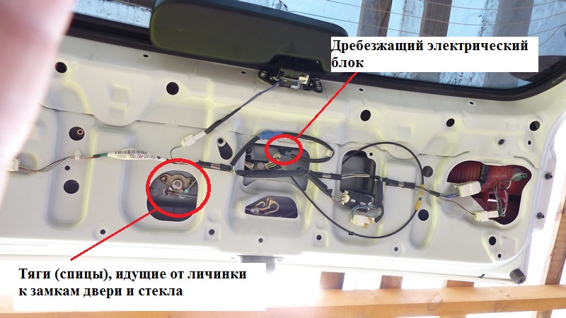 Самые гремящие элементы - это тяги замков двери и стекла, а также небольшой черный блок возле замка стекла. Начнем с блока, тем более, что он в центре двери. Вложение: