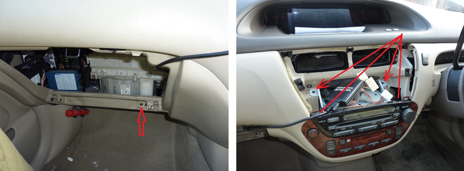 Промываем радиатор. Немного фэйри плюс теплая (лучше погорячее) вода. Трясем всяко-разно и сливаем. И так несколько раз. Проверяем - заливаем горячую воду (просто закрываем холодную) и щупаем радиатор - он должен прогреться весь равномерно. В конце водных процедур промываем радиатор дистиллированной водой (но можно обойтись и без этого) и сушим (можно положить на батарею, если отопление уже дали). С радиатором закончили. Снимаем пассажирский бардачок. Откручиваем болт возле правого крепления бардачка и четыре болта магнитолы (саму магнитолу не снимаем). Это нужно для того, чтобы потом при установке радиатора можно было отогнуть нижний пластик торпеды.