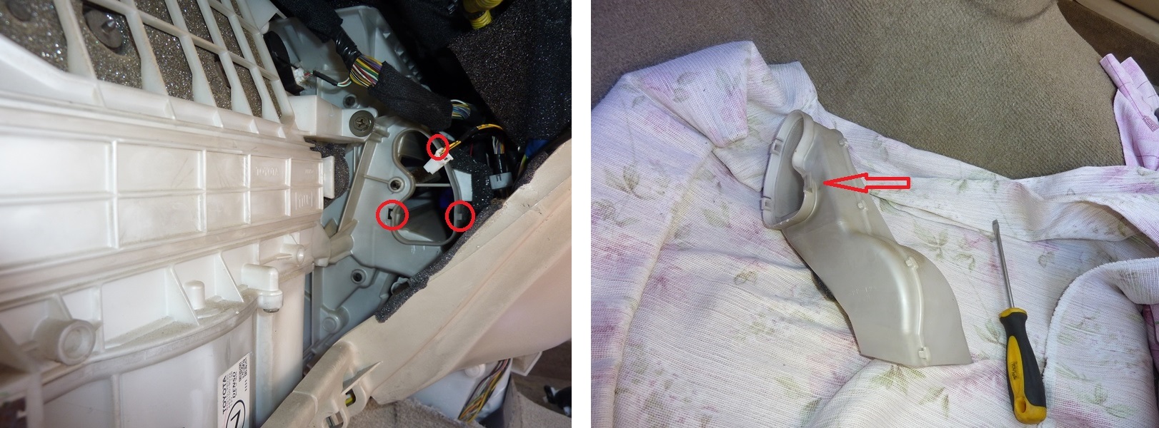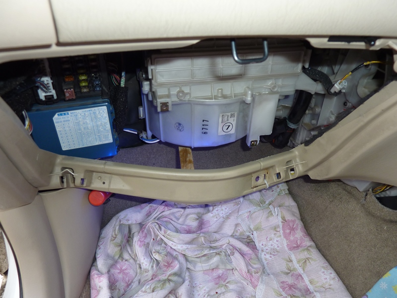 Снимаем накладку внизу посередине торпеды - откручиваем по саморезу с каждой стороны и тянем на себя (посередине у нее две защелки). Теперь нужно снять воздуховод "в ноги" с пассажирской стороны (на нем сверху крепится фишка, ее нужно будет отстегнуть). Конкретной инструкции, как это сделать, нет. Я делал следующим образом. Шлицевой отверткой (на фото), нырнув вниз под воздуховод, я отщелкнул одну из защелок. Она, получается, ближе к моторному отсеку. Там она одна с той стороны, две других расположены с ближней к салону стороны. После этого аккуратно, но настойчиво, тянем воздуховод влево и на себя (ну или примерно так). Одним словом, шевелим его туда-сюда. Он и снимется.