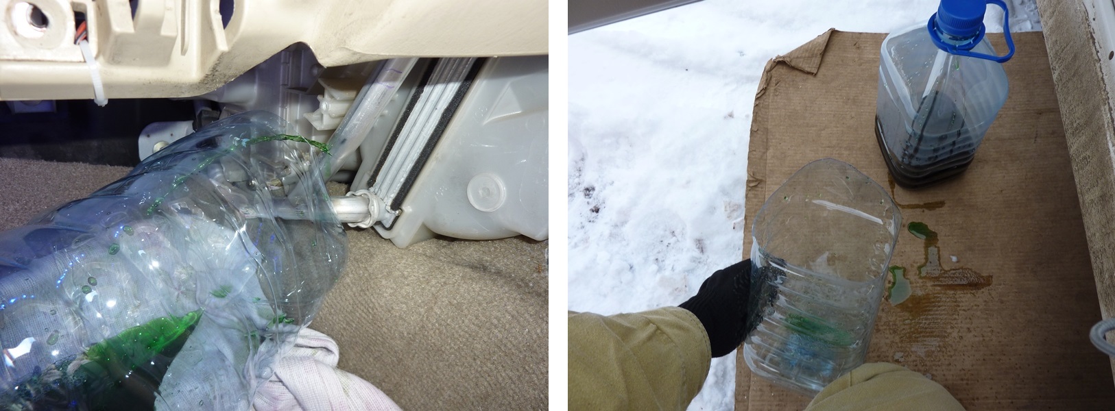 Нам понадобятся две пластиковые пятилитровые канистры. Либо одна, если слитый антифриз обратно заливать не предполагается. Если все же захотите его потом залить назад, то вторая канистра нужна для перелива в нее антифриза из первой. Кстати, лучше сразу взять обе - антифриз же в любом случае надо будет куда-то выливать. Не рядом же с машиной свинячить. В общем, одну из канистр нам нужно обрезать таким образом, чтобы ее можно было подсунуть под нижнюю (входную) трубку радиатора. Да так, чтобы трубка по возможности максимально оказалась над канистрой. Чтобы не уделать пол, одним словом. Далее определяемся с местом отпиливания трубок. Нужно, чтобы между отрезанной трубкой, идущей из радиатора, и отрезанной трубкой, идущей в салон, было примерно сантиметров восемь. То есть нужно пространство, достаточное для того, чтобы можно было потом надеть шланги. Определились, пилим. Ножовкой туда не подлезть, поэтому не спеша, с чувством, толком и расстановкой, орудуем полотном от ножовки.