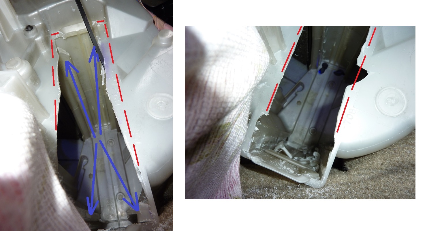 Я начинал с верхней трубки, антифриза слилось немного. Сразу перелил его в резервную канистру. Потом отпилил нижнюю трубку, антифриза слилось побольше. Точный объем не скажу, потому как в прошлый раз у меня слилось литра полтора-два, а в этот раз несколько больше. Кстати, слитый антифриз заливать потом обратно не рекомендую по той причине, что при отпиливании трубок в него попадет металлическая стружка. Итак, трубки отпилили, стружку аккуратно вытащили ватными палочками. Теперь вытаскиваем родной радиатор. Дергаем его всяко-разно, пока не вылезет. Всё. Поле для битвы за тепло свободно! Расширяем отверстие с помощью ножовки, канцелярского ножа и такой-то матери. Кто-то использовал для этого паяльник. Тоже, в общем, хорошая идея. Как предложил один из форумчан, не помешает сделать болванку радиатора от ипсума (можно из плотного картона вырезать контур торца радиатора), иначе, если несколько раз, примеряя, вставлять и вытаскивать его туда-сюда, то можно просто радиатор испортить. На фото контур нарисован примерно, для наглядности. Синим отмечены четыре планки (я их полозьями называю), которые нужно будет самым аккуратным и неспешным образом срезать стамеской. Лучше по чуть-чуть, а не сразу "под корень", иначе из-за ломкости корпуса можно проделать в нем дыру. У меня так и получилось. Ничего страшного, об этом позже.