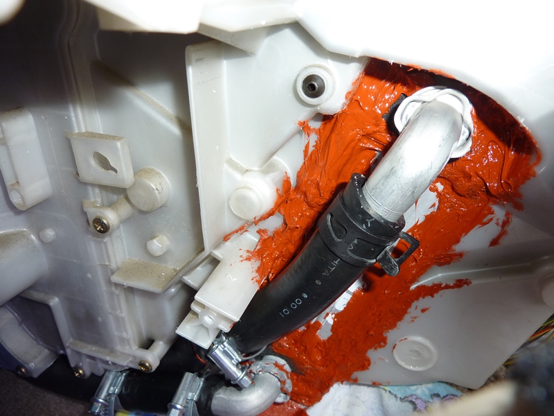 Всё, на этом работа закончена. Осталось залить антифриз и выгнать из системы воздух, потом понаблюдать пару дней, чтобы ничего не капало, а потом подтянуть хомуты (они поначалу немного расслабляются), поставить обратно воздуховод и вернуть на место декоративную накладку.