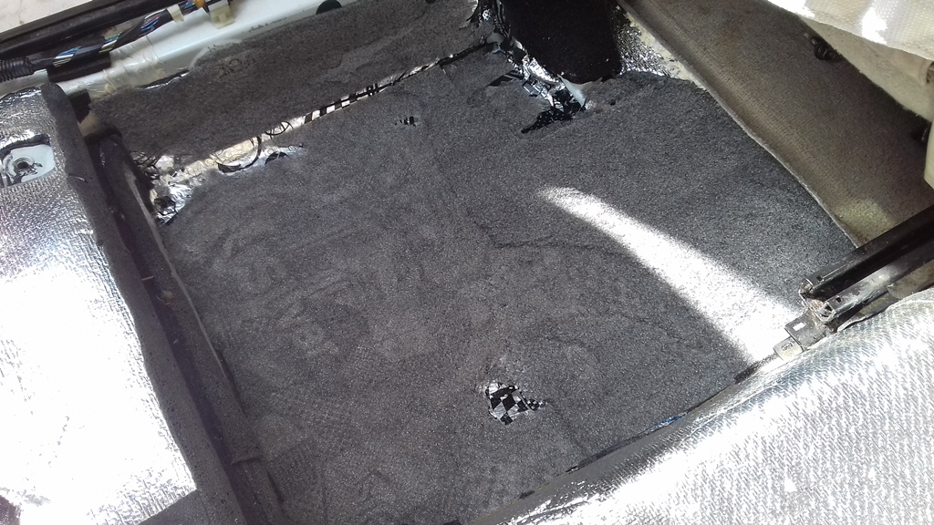 Не берусь утверждать (замеров не проводил), но мне показалось, что дорестайловый ковер немного потолще, чем рестайловый вместе с подложкой. Как бы там ни было, чтобы не мучиться с укладкой нового ковра, решил снять слой шумоизоляции. Виброизоляция в любом случае останется. Во-первых, она необходима. Во-вторых, она имеет небольшую толщину (миллиметра три после прикатки). В-третьих, её хрен отдерешь. Проще повеситься. Да и как уже сказал, она не мешает. А вот верхний слой решил снять. Тем более, что при такой конструкции дорестайлового ковра какая-то дополнительная шумка не нужна в принципе. С грустью взглянув на свою работу трехлетней давности, приступил к вандализму. Вложение: