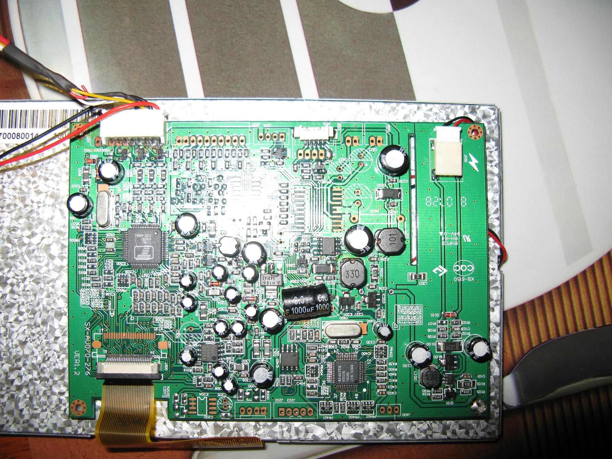 Здесь буду собирать воедино всю инфу о моем детище. Идея проста - поставить в машину комп. Но это не какой-то мега-медиацентр - просто что-то типа навороченного мп3-плеера ))), т.к. в бюджете урезан... Что сделано на данный момент: 1) куплен 7-дюймовый(китайский нонейм) цветной монитор...2 видеовхода и 1 аудиовход(тюльпаны) + сигнальный провод(пока не понял как он работает, пробовал тупо цеплять на +12В - ничего не происходило)....2300р... 2) куплена полочка от комплектации с монитором (есть идея поставить монитор туда)...500р.. 3) на днях должна быть куплена рамка под 2din магнитолу (также есть идея попробовать туда поставить монитор, т.е. либо в панель приборов либо на место магнитолы - пока не определился)...400р... 4) для 2-го видеовхода куплен видео-кабель для моего телефона )))) (Witu имеет видеовыход)...115р... 5) собран из старого хлама комп...0р... планы: 1) выбрать место установки монитора... 2) придумать как преобразовать сигнал из VGA в RCA... 3) спаять доп. схему для интеграции обычного БП в сеть авто... рассуждения по поводу покупки готового решения выложу позже...пока написал, что успел... небольшое продолжение... купил рамку под 2din магнитолу...стал примерять монитор - не влезает...решено было разобрать монитор... итак, внутренности - радует, что провода на разъемах, а не припаяны...и стало ясно почему не работал сигнальный провод - он вообще не заведен на плату, тупо отрезан...видны две микросхемы - Realtek RTD2120L и некая T118L... Вложение: