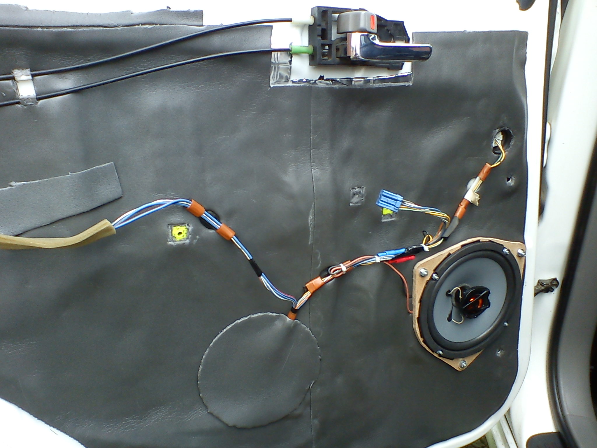 Понятно, жаль ну да ладно. Поставил я уже один динамичек чайзеровский отпилив от него предварительно всё лишнее ( это была юбочка вокруг магнита. Сместил отверстия крепления в пластмассе на 1см к центру, встал как родной, разъём даже подошел. Включил саунд, думаю сейчас порадуюсь, фиг там, звучок как от первых китайских магнитофонов, мембрана дергается а толку нет. Думаю фиг с ним, дверь надо собрать, и после сборки двери в ней проснулся басс, меня это взбодрило, думал всё зря будет,нет, сделаю и во второй двери то же самое.