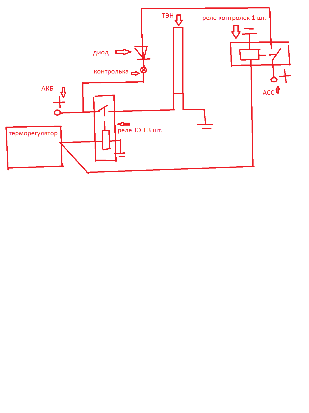 По первой схеме лампочка гореть никогда не будет, т.к. на нее два плюса подаются. Без реле АСС, если не нужно чтоб горела всегда при выключенном тэне, поставь кнопку, при нажатии будет проводится проверка целостности тэнов. Из двух вторых вариантов первый ни о чем, для второго нужно токовое реле. зачем усложнять только не знаю, на приусах никакого контроля тэнов насколько я знаю нет.