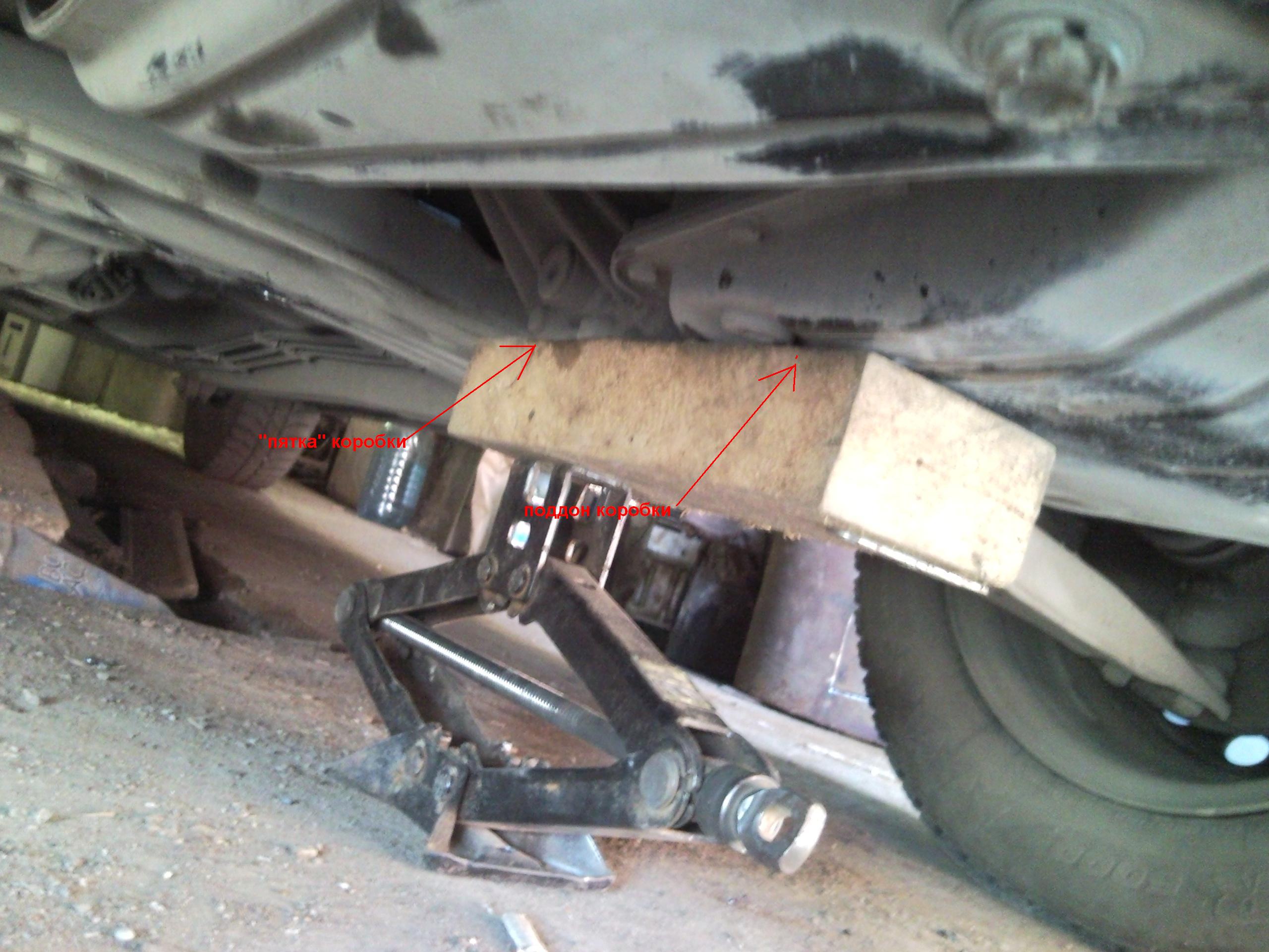 - далее берем домкрат и небольшой деревянный брусок, ставим под двигатель и немного его приподнимаем...я упирал брусок в кожух гидротрансформатора слева от продольной балки...