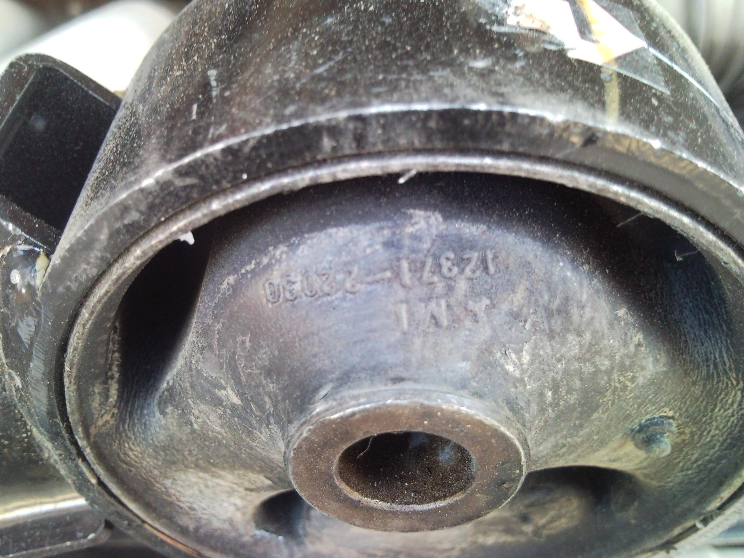 - откручиваем болт крепления двигателя к подушке и вуаля - она у нас в руках...на фото видно оторванную часть слева...также заметил, что код подушки есть на картридже - наверно так как раз можно подбирать сами картриджи, а не целиком подушки...также заметил, что стояла подушка с немного другим кодом - 12361-74530...кроме кода есть еще некая цифра возле треугольничка - на старой это М2, на новой М14...