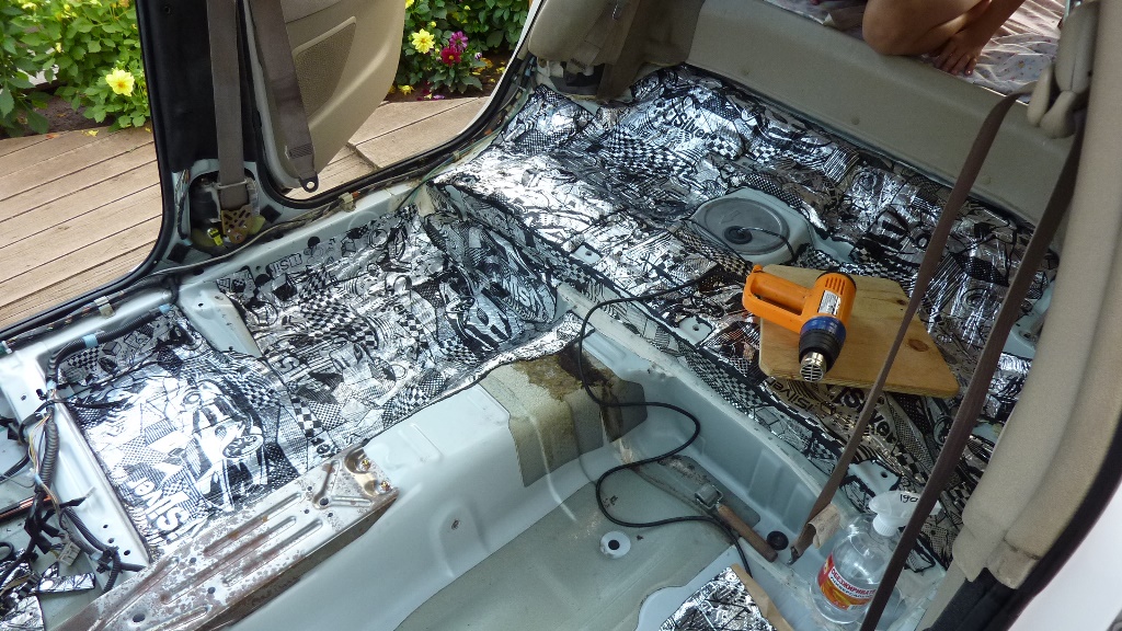 Что еще нужно сказать: перед работой не помешает застелить сидения, чтобы не налить на них обезжириватель (хотя это и не страшно) или не намазать битума (а вот это плохо). Подытожим. Шумить крышу было одно удовольствие - никаких выштамповок, только прямой металл. Катай - не хочу.  Самым тяжелым элементом кузова для меня был багажник, вот там я просто замучился прикатывать вибру в куче выштамповок, впадин, выпадин и всякой другой хрени.  Второе по сложности место поделили двери (наличие труднодоступных мест) и пол (большая площадь, наличие выштамповок, непростая сборка салона). Про пол выложу фотоотчет чуть позже.