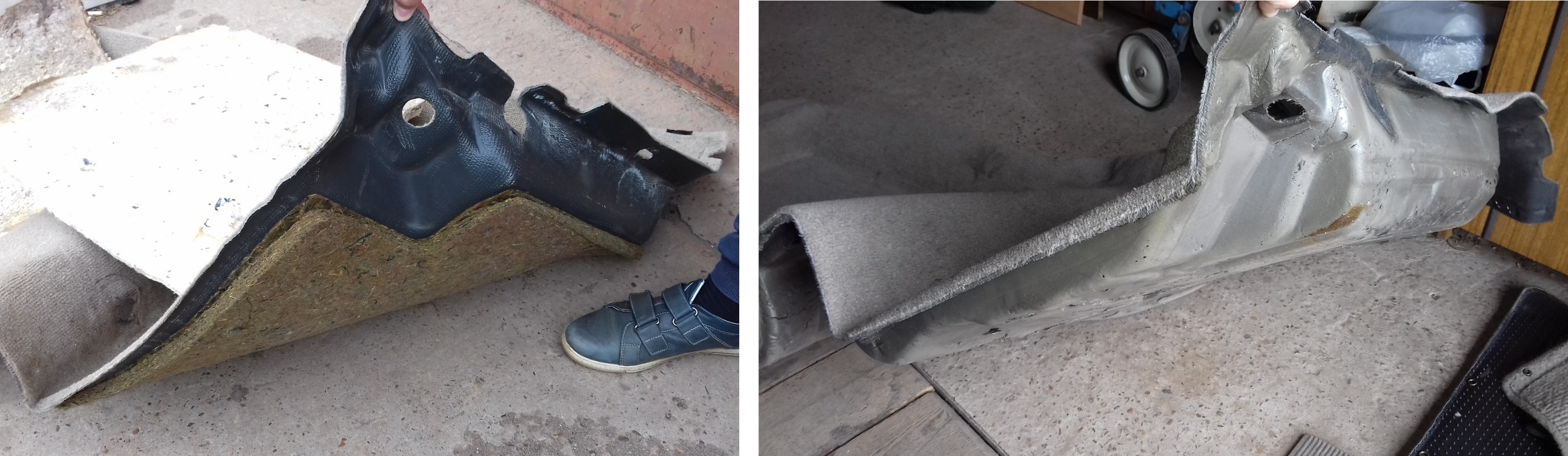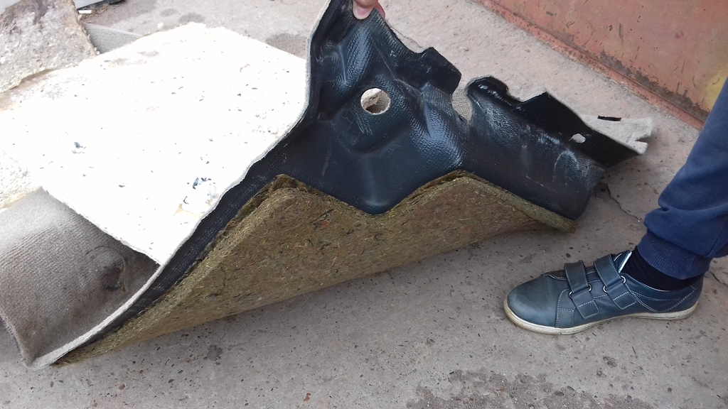 На рестайле к ковролину всего лишь приклеена теплошумоизоляция (что-то вроде войлока), плюс дополнительная подложка на пол. На дорестайле же ковер представляет собой массивную литую конструкцию из ковролина и чего-то похожего на вспененную резину. Выглядит впечатляюще. Подложку пришлось отрезать, часть её осталась под передним ковром. Вложение: