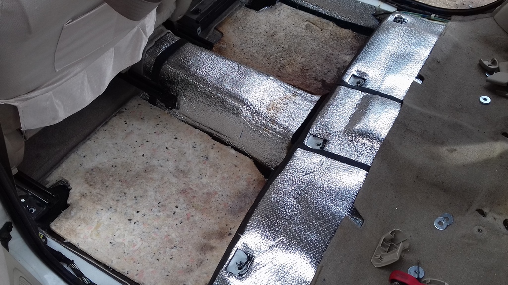 Не берусь утверждать (замеров не проводил), но мне показалось, что дорестайловый ковер немного потолще, чем рестайловый вместе с подложкой. Как бы там ни было, чтобы не мучиться с укладкой нового ковра, решил снять слой шумоизоляции. Виброизоляция в любом случае останется. Во-первых, она необходима. Во-вторых, она имеет небольшую толщину (миллиметра три после прикатки). В-третьих, её хрен отдерешь. Проще повеситься. Да и как уже сказал, она не мешает. А вот верхний слой решил снять. Тем более, что при такой конструкции дорестайлового ковра какая-то дополнительная шумка не нужна в принципе. С грустью взглянув на свою работу трехлетней давности, приступил к вандализму. Вложение: