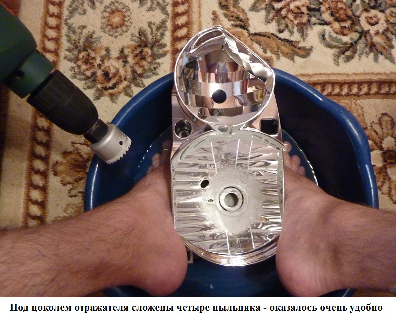 Поскольку торцевые пилы продаются в основном только для дерева (будьте внимательны: бывают еще тонкие мягкие торцевые пилы - их не берите), приготовьтесь к долгому процессу. Каждый отражатель я рассверливал что-то около часа!  Думал, этот проклятый цоколь никогда не кончится. Очень важный момент. Сверлить весь цоколь до конца не нужно. Не тратьте силы и время. Исходите из того, что миллиметров 8-9 цоколя нужно будет отпилить. То есть практически заподлицо с отражателем.---------------------------------------- Я это не учел и первый отражатель сверлил до упора. Вложение: