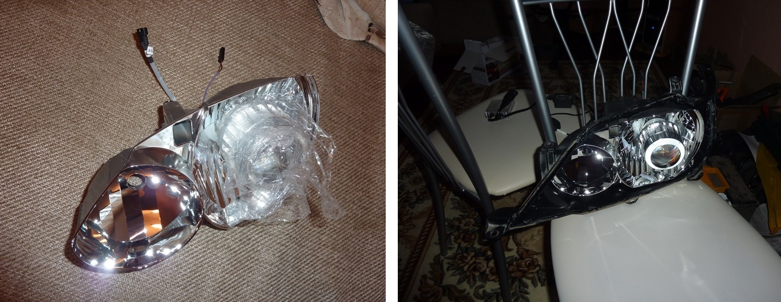 Приехал на стоянку, снял аккумулятор, принес домой. Пока нес, руки стали длиннее сантиметров на десять. Сначала проверил работу "ангельских глазок", поскольку это самое простое.  Потом подключил сами линзы. Вложение: