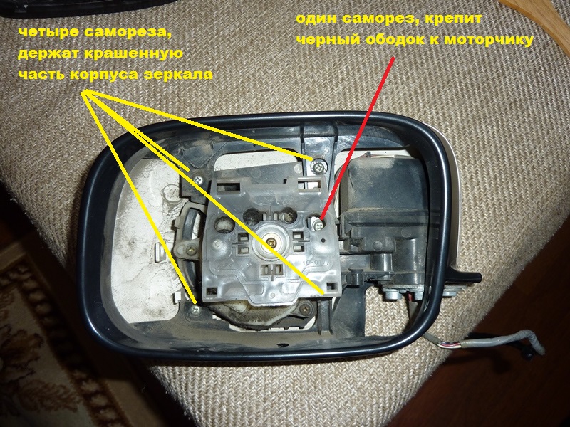 09.04.2014Недавно случайно (ну конечно случайно, как будто бывает по-другому  ) разбил корпус левого зеркала. На разборах не оказалось, поэтому пришлось обратиться к форумчанам. Спустя несколько дней было куплено ухо в сборе. Спасибо Андрею27 (он же Дед Андрон, он же Андрей Два Метра Семь Зубов, он же Андрюха Полбампера  ). Но была одна загвоздка. Купленное зеркало оказалось 5-контактным, а у меня стояло 7-контактное, т.е. с подогревом. Поэтому нужно было разобрать оба уха и переставить мне крашенную часть и черный ободок взамен сломанных. На форуме есть несколько ссылок на темы по разборке боковых зеркал, но для удобства тех, кому это может понадобиться, выкладываю подробный сводный фотоотчет. Часть 1. Разборка бокового зеркала. Разбираем купленное 5-контактное зеркало. Для этого нужно снять декоративную накладку динамика-пищалки (она на двух клипсах), снять дверное полотно ( инструкция), открутить пищалку (один саморез), отсоединить фишку зеркала и открутить три болта, которые крепят ухо к двери (два болта видно сразу, третий спрятан за резиновой заглушкой). Ухо снято. Откручиваем нижнюю крышечку. Видим три болта. Откручиваем. Треугольная часть теперь держится только на проводах. Вложение: