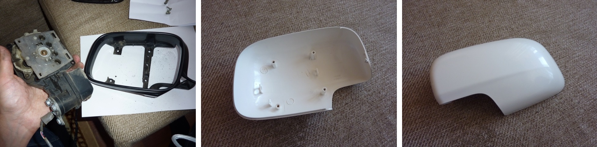 Сначала не понял, как снимается фишка (чтобы надеть на механизм новый черный ободок, зеркало нужно отсоединить, иначе не пролазит). Пытался снять крышечку, откуда провода выходят, но оказалось, фишка сделана по типу "вилки". Вложение: