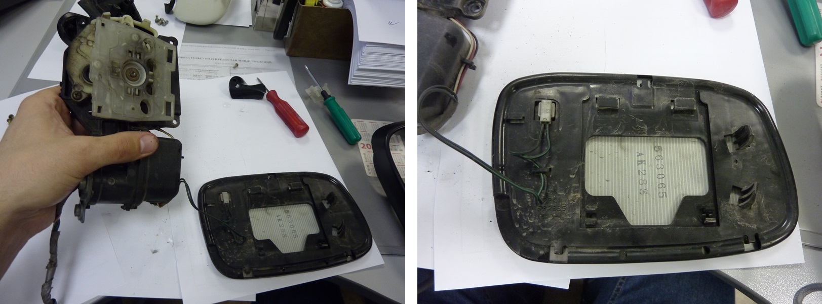 Зеркало снято. Этапы разборки, описанные в первой части, повторять не буду. Единственное, предлагаю похвалить умных японцев. Провода круглой части фишки специально немного удлинены, чтобы при вытаскивании проводки через треугольник одна часть фишки оказалась перед другой и таким образом все спокойно прошло через отверстие. Вложение: