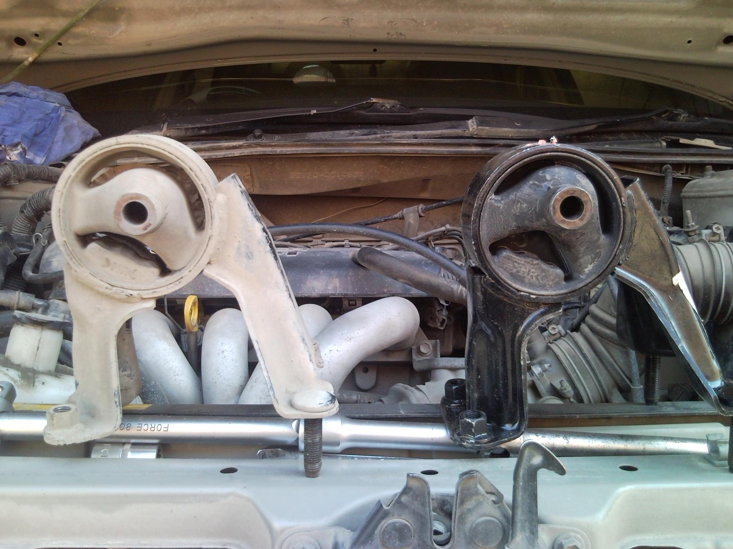 - откручиваем болт крепления двигателя к подушке и вуаля - она у нас в руках...на фото видно оторванную часть слева...также заметил, что код подушки есть на картридже - наверно так как раз можно подбирать сами картриджи, а не целиком подушки...также заметил, что стояла подушка с немного другим кодом - 12361-74530...кроме кода есть еще некая цифра возле треугольничка - на старой это М2, на новой М14...