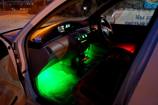 Как и обещал - выкладываю фотоотчет. Заморочился я наружней подсветкой ручек дверей. Все началось с консультации у сотрудников ГИБДД, можно ли и каким цветом. Ручки подсвечивать можно любым цветом т.к. про ручки в правилах ничего не сказано. Основной гемор заключался в снятии самих ручек и вырезании полостей под светодиоды. Полости в ручках вырезал ручной гравировальной машинкой, вышло аккуратно. Светодиодную ленту купил хорошую (там где сегменты близко друг к другу расположены). Советую на ленте не экономить, покупать в магазине (сертифицированная, брака практически нет) а не у китайцев (брака много, перегорает...). Советую предварительно снять с ленты прозачную силиконовую оболочку - бывает что отслаивается со временем. Лента хорошая, но на всякий случай (после китайских бракованных лент не доверяю :smile: ). После установки ленты полости залил пластиком с клеящего пистолета, светодиоды не нагреваются, клей не расплавят - проверял в течении суток в гараже. Получилось что на ощупь ручка ровная, свет изнутри, диоды в заливке заподлицо, наружу не выпирают. Сам пластик из пистолета стал матовым как застыл, свет рассеивается, точек от светодиодов не видно. Запитался от стеклоподъемников (при зажигании появляется плюс) - отдельные провода тянуть времени не было, да и не напрягают меня постоянно святящиеся ручки. Красные катафоты в передних дверях подсветил тройной светодиодной лентой, питание от стеклоподъемников. Салон в ногах и подсветка бардачка питание брал от габаритов. Изначально подсветку в ногах я делал синего цвета (как в бардачке), но потом поменял на зеленый - приятней глазу, мягче светит. Сзади у пассажиров тоже подсвечено зеленым, не стал фотать. Рекомендую делать подсветку в ноги из 1 минимально возможной части ленты (3 светодиодных сегмента). На фото выглядит сильно ярко, на самом деле тусклее, самое то, по глазам не бъёт. Рамка номера - белая светодиодная лента+клеящий пистолет. В регуляторах климата и панели автомата лампочки заменены на зеленые светодиоды. В панели автомата буду менять на белый цвет - плохо видно какой режим включен. Дневные ходовые огни светодиодные в алюминиевом корпусе, подключал на аккумулятор, управляющий провод кинул на генератор. Получается они зажигаются после того как запустится двигатель. Гаснут "вежливо", через полминуты после того как выключается зажигание - успеваю выйти из машины и дойти до подъезда при их освещении))) В туманках светодиодные лампочки. Короче получилось очень симпатично, кто видел - нахваливают, очень понравилось, хотят так же))) Все это делалось в разное время в течении года, могу только сказать что ручки дверей делал примерно полутора суток, все обдумывая. Работа проделана большая, были трудности, но результат того стоил. В планах поменять лампочки в салонных плафонах на светодиоды. Фото выложу. Как-то так))) Далее без комментариев.