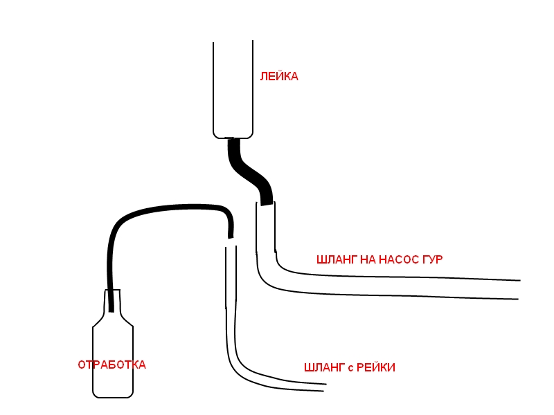 Подливаем жидкость и крутим руль пока из тонкого шланга не пойдет такая-же как заливаем. Потом ставим чистый бачек, наливаем уровень и на холостую еще несколько раз крутим руль от начала до конца. Теперь заводим мотор и наслаждаемся прекрасной работой ГУРа.