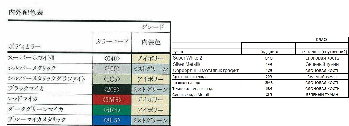 У меня цвет кузова 199. Тут все совпадает. А вот где японцы в моем сером салоне зеленый туман разглядели, непонятно. :mrgreen: