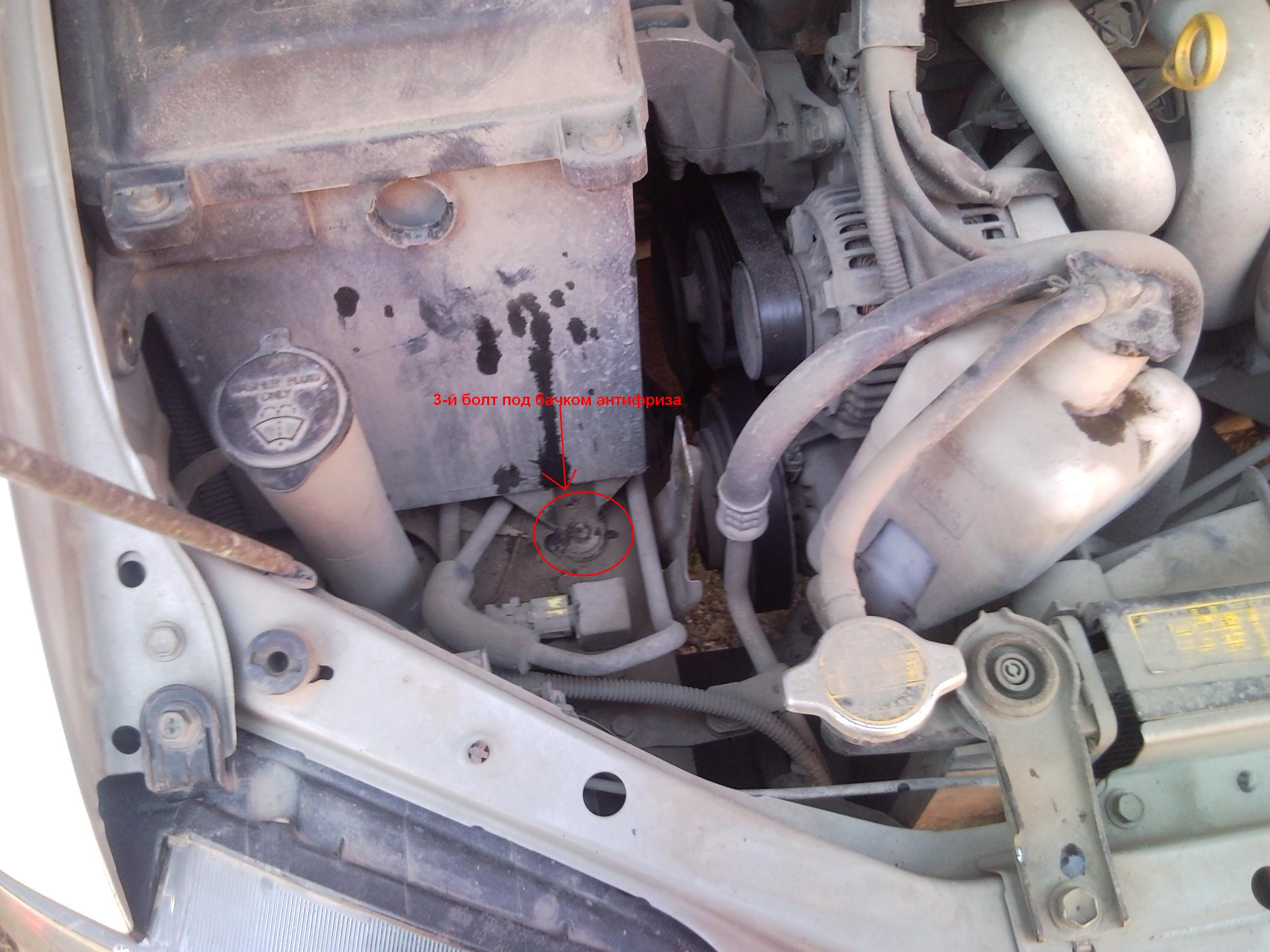- для начала, т.к. нужно будет приподнимать двигатель, решил отцепить его от правой подушки(ее еще называют гелевой)...для этого нужно открутить блок EFI - он стоит на ней и мешает подлезть...откручиваем 2 верхних болта, снимаем бачок с антифризом, откручиваем нижний болт...
