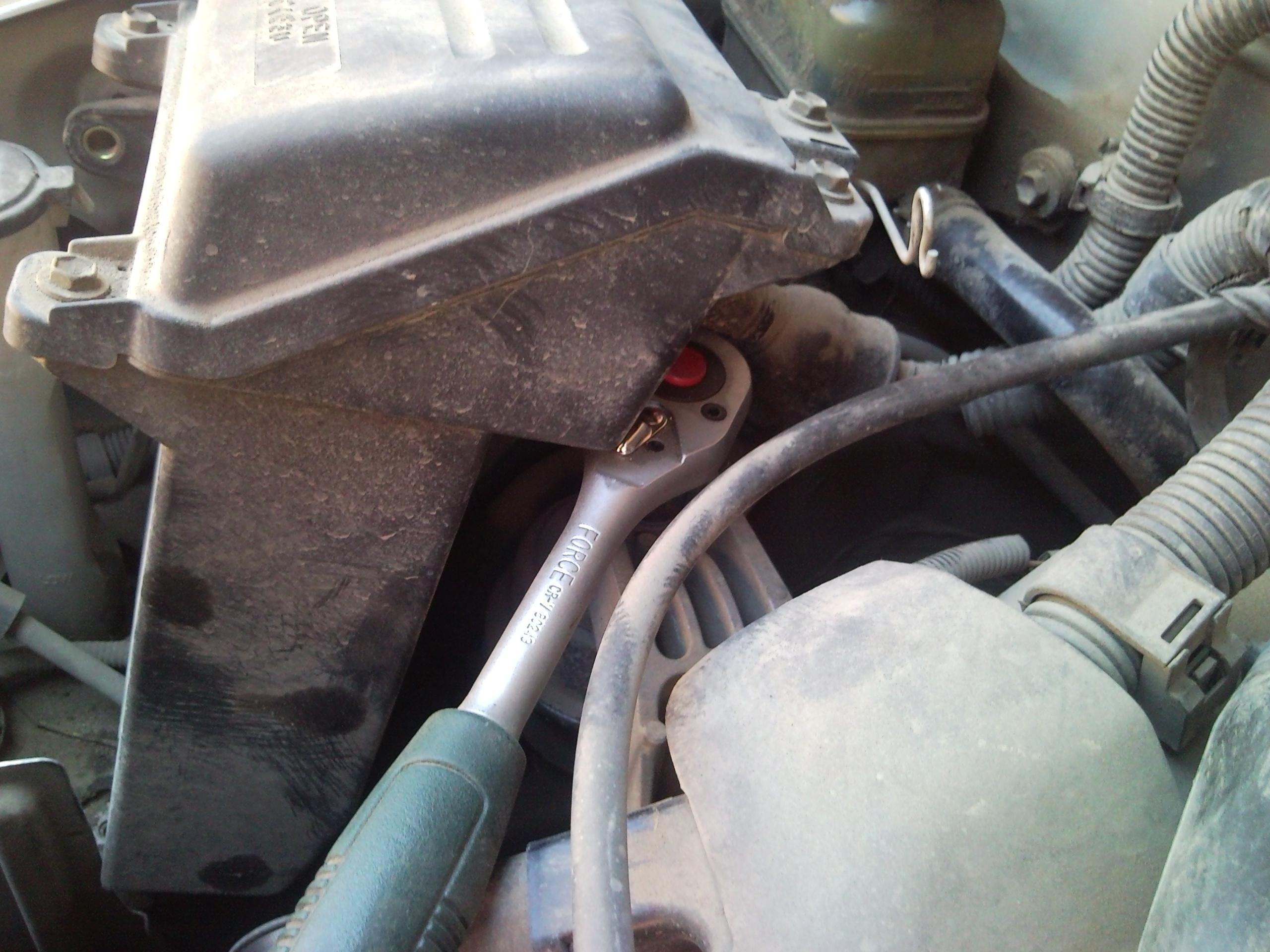 - отворачиваем болт крепления двигателя к подушке...тут тоже пришлось помучиться - подлезть к болту снизу я не пробовал, т.к. казалось, что это невозможно....а сверху, чтобы его сорвать нужен довольно длинный вороток с минимальным люфтом, т.к. хоть к болту и можно подлезть, но свободы для воротка там мало...