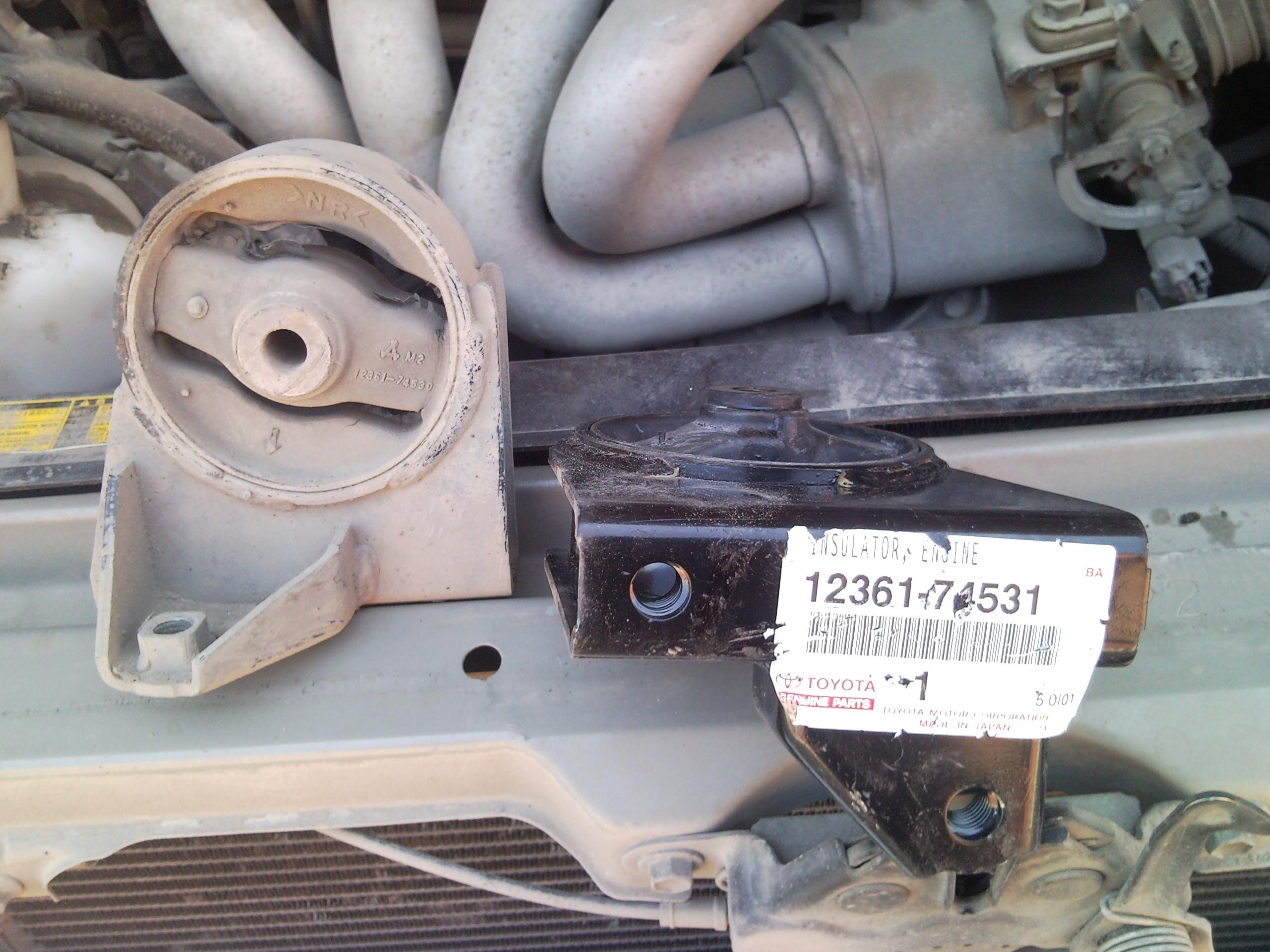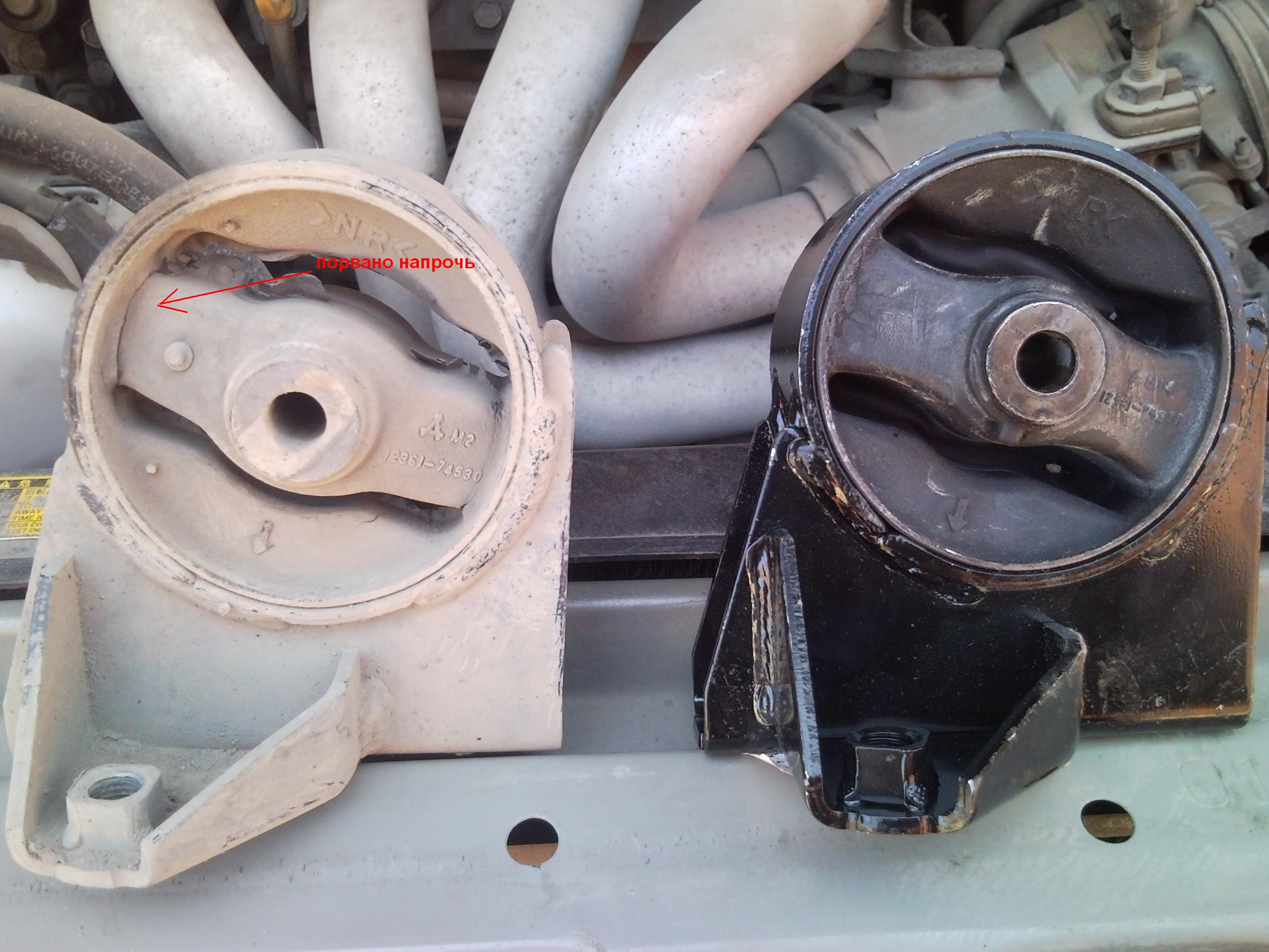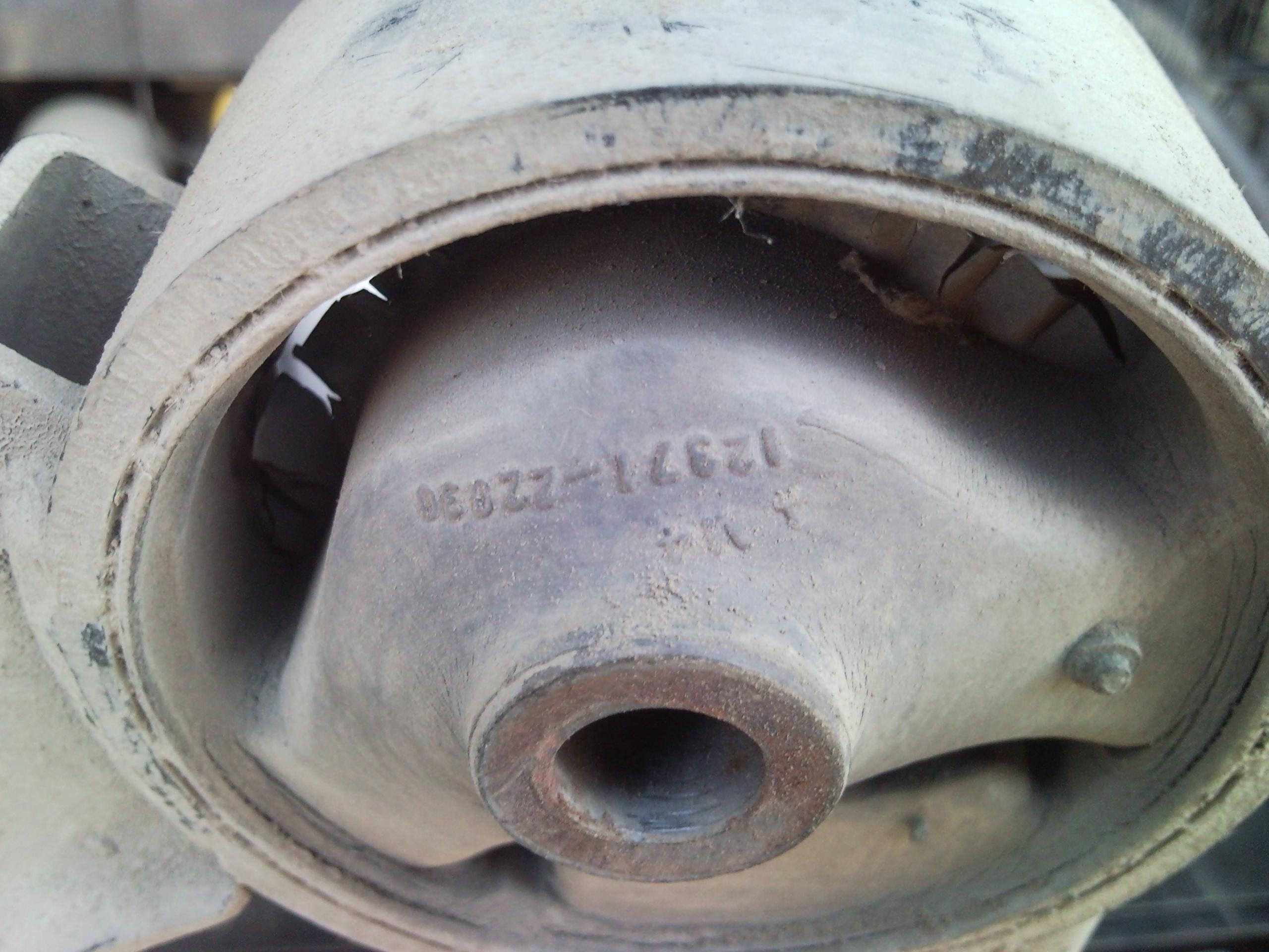 - откручиваем болт крепления двигателя к подушке и вуаля - она у нас в руках...на фото видно оторванную часть слева...также заметил, что код подушки есть на картридже - наверно так как раз можно подбирать сами картриджи, а не целиком подушки...также заметил, что стояла подушка с немного другим кодом - 12361-74530...кроме кода есть еще некая цифра возле треугольничка - на старой это М2, на новой М14...