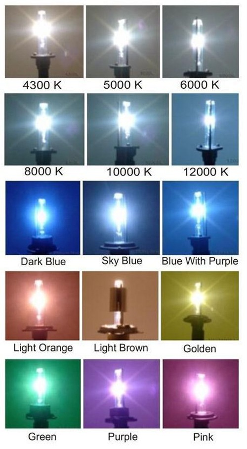 Цвет ксенона представляет собой модель, которая говорит, как должен быть нагрет газ внутри колбы, чтобы лампа светила тем или иным цветом. На выбор множество производителей предлагает ассортимент из трех основных видов цветовых температур: