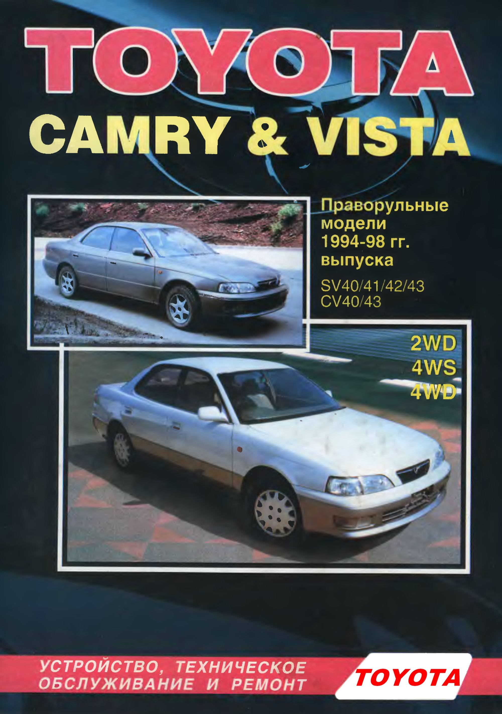 Toyota Camry & Vista 1983-1995 гг. выпуска с левосторонним и правосторонним рулевым управлением, 2WD & 4WD. В руководстве подробно описаны бензиновые четырехцилиндровые двигатели 1S (1,8 л), 1S-E (1,8 л), 1S-i (1,8 л), 2S (2,0 л), 2S-E (2,0 л), 3S-FE (2,0 л) 3S-GE (2,0 л), 4S-FE (1,8 л), 4S-R (1,8 л), 5S-FE (2,2 л) и шестицилиндровые двигатели (V6) 1VZ-FE (2,0 л), 2VZ-FE(2,5 л), 3VZ-FE (3,0 л) и 4VZ-FE (2,5 л), а также дизельные двигатели 1С (1,8 л), 2С (2,0 л) и 2С-Т (2,0 л с турбонаддувом).